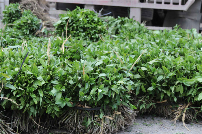 基地上,前来务工的群众三三两两聚在一起忙着手上的活计,一捆捆板蓝根正待装车,整个基地格外热闹。